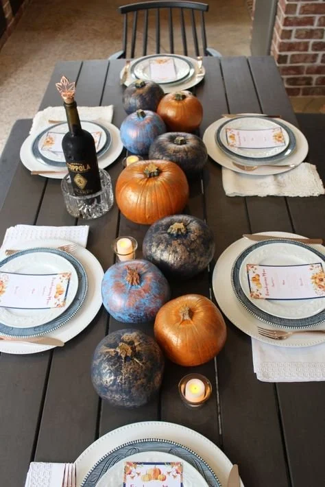 This chic color palette adds elegance and sophistication to your fall table décor, while still keeping things warm and festive. Pair your pumpkins with a matching printed menu and soft tealight candles for a cozy, inviting glow that’s perfect for Thanksgiving dinner or any autumn gathering.