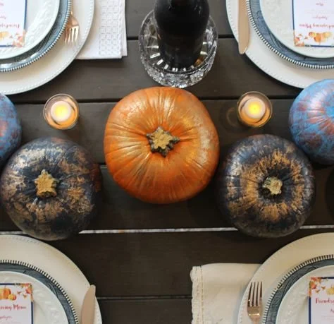 Simple Thanksgiving Tablescape: How to Elevate Your Fall Table with Painted Blue & Bronze Pumpkins
