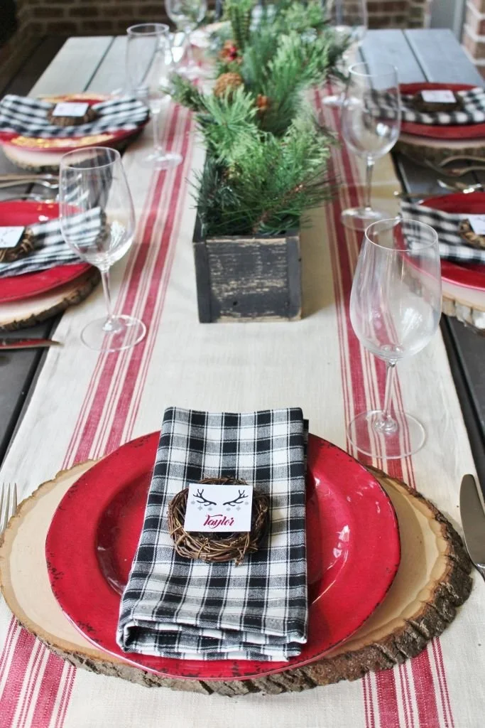 Think candles, plaid napkins, and handwritten place cards. It’s the little details that bring farmhouse holiday charm to life.