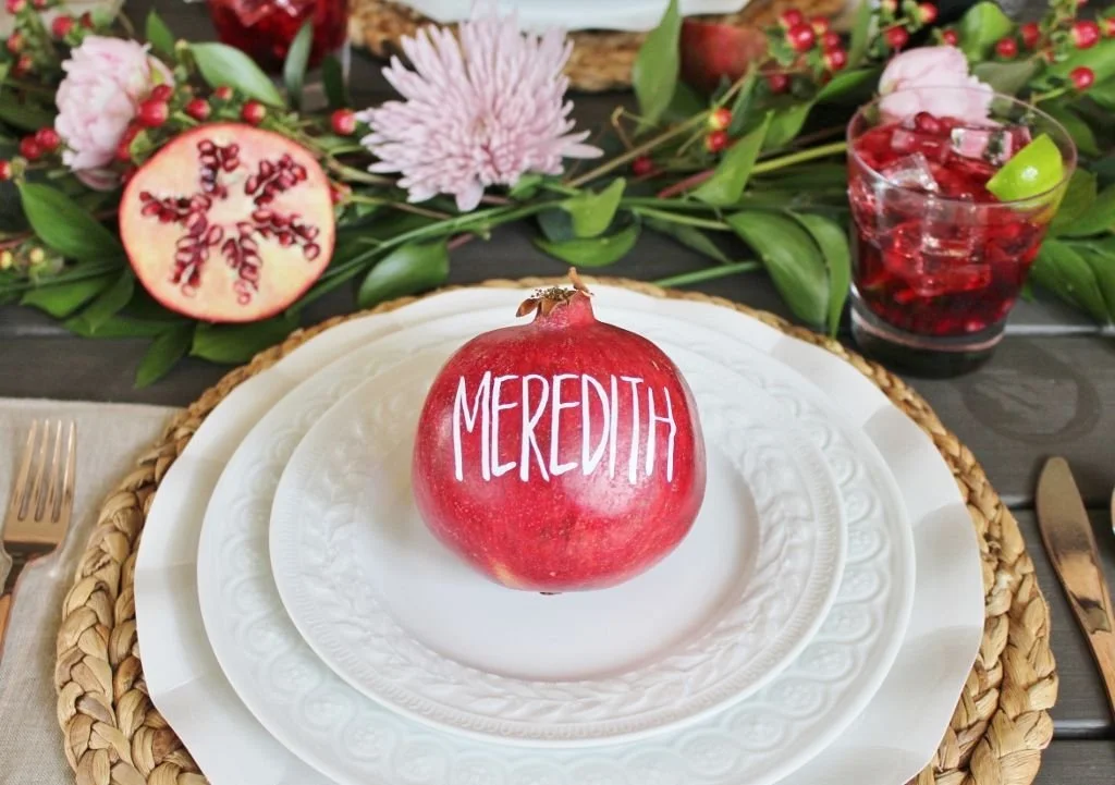 For a personalized touch, I turned whole pomegranates into custom place cards! Using white vinyl and a home cutting machine, I created name decals and applied them directly to each fruit.