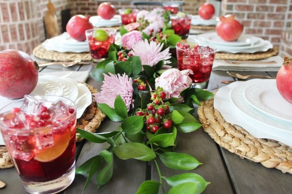 To bring this pomegranate theme to life, I started with a fresh floral table runner — a simple yet stunning way to add natural beauty to your tablescape.