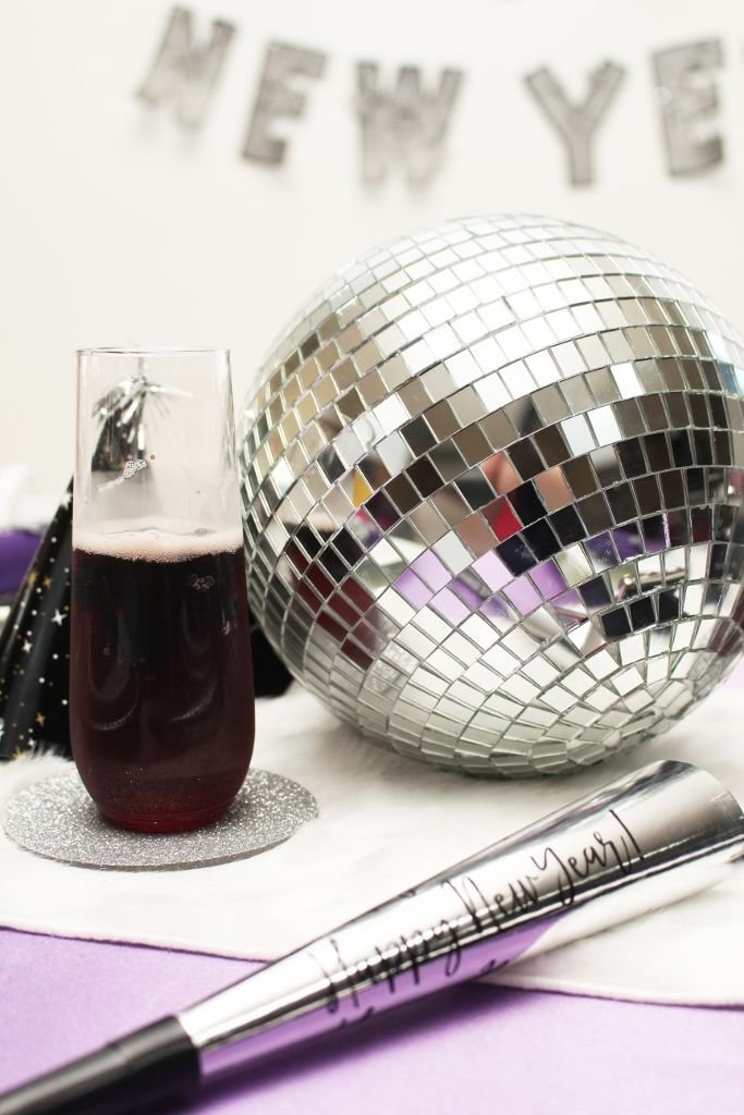 For added fun, we sprinkled in party blowers, mini NYE hats, and a signature blackberry-raspberry champagne cocktail, served atop glittery silver coasters.