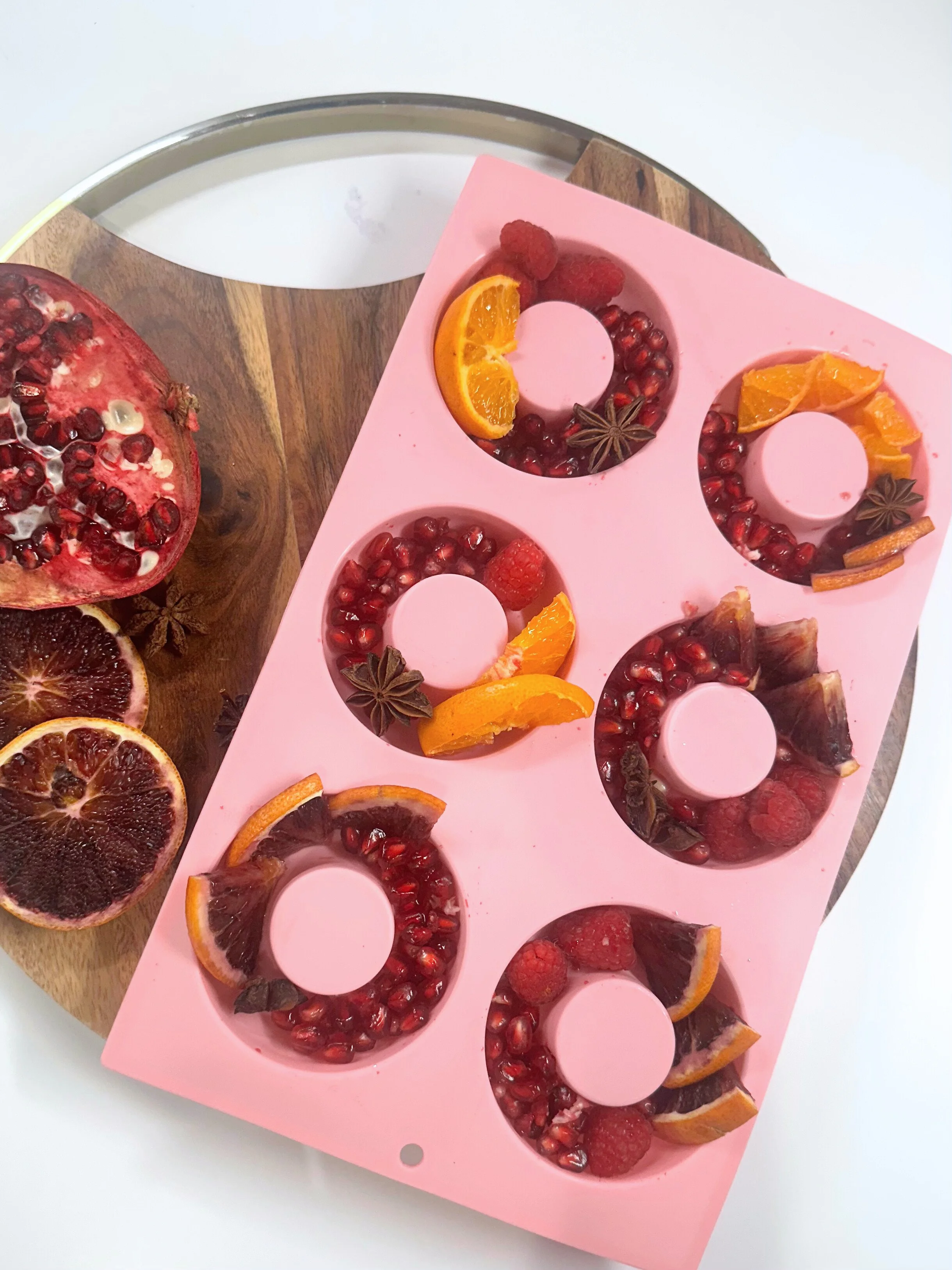 Place a few pomegranate seeds, raspberries, orange slices (we cut ours into quarters), and a star anise pod in each well of your circular tray.